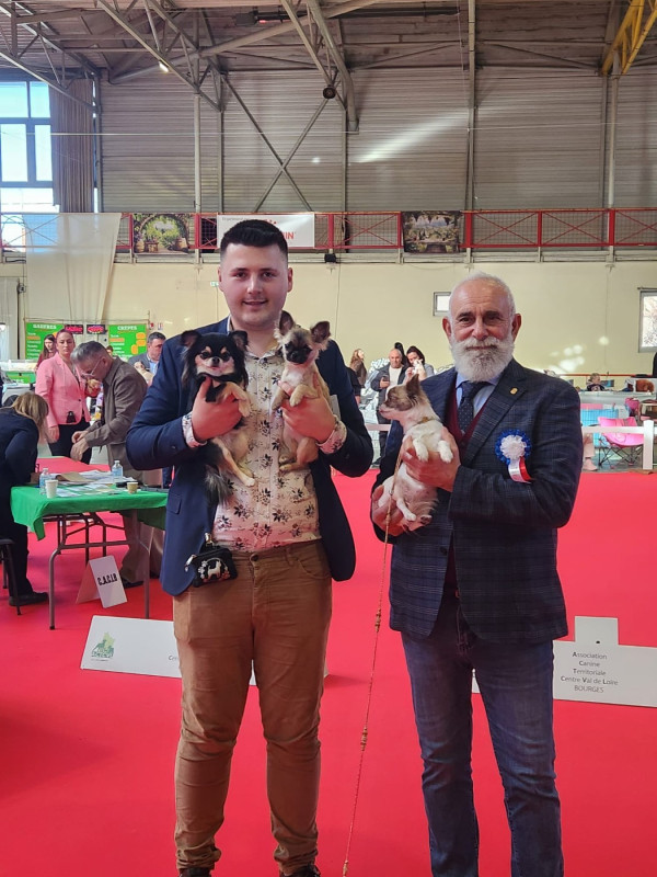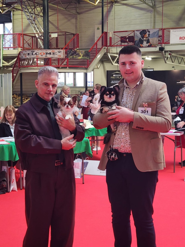 Dès que j’ai croisé le regard de Kira sur une photo de son éleveuse. Ça était le coup de foudre. Elle est issue principalement de champions. C’est une femelle très douce, calme, un caractère en or. Elle est très bien construite, courte et très compacte, une très belle tête en pomme, chanfrein court, mais un stop très marqué. Une perle. Grâce aux différents excellents résultats, Kira est multi jeune championne internationale.